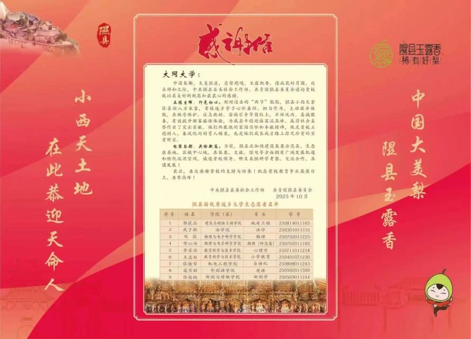 武子微的服务不仅赢得了游客的广泛认可,更得到了隰县当地部门的肯定。中共隰县县委社会工作部、共青团隰县委员会在致大同大学的感谢信中提到,返乡学子“心怀桑梓、担当作为,不辞风雨、真诚服务”,有效提升了游客体验,为景区平稳应对客流高峰作出突出贡献。而武子微正是这一群体中的优秀代表,她用行动展现出当代大学生的家国情怀与责任担当,既是大同大学“立德树人”育人成果的生动体现,也为家乡文旅事业发展注入了青春力量。